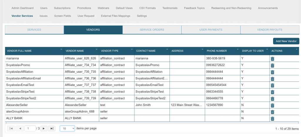 • Vendor Type: The type or category of the vendor (e.g., test, seller, affiliation_contract).